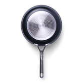 Frigideira em alumínio forjado com 3,5mm de espessura. Revestimento antiaderente de 3 camadas livre de PFOA. Cabo rebitado em aço inox.