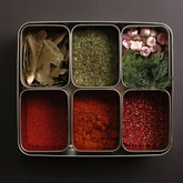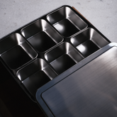 O conjunto é composto por uma caixa de inox com tampa, contendo seis compartimentos individuais e removíveis, permitindo personalizar o uso de acordo com a necessidade do momento: seja para armazenar especiarias, molhos, temperos ou alimentos picados, como alho, gengibre e cebolinha — tudo ao alcance das mãos durante o preparo.