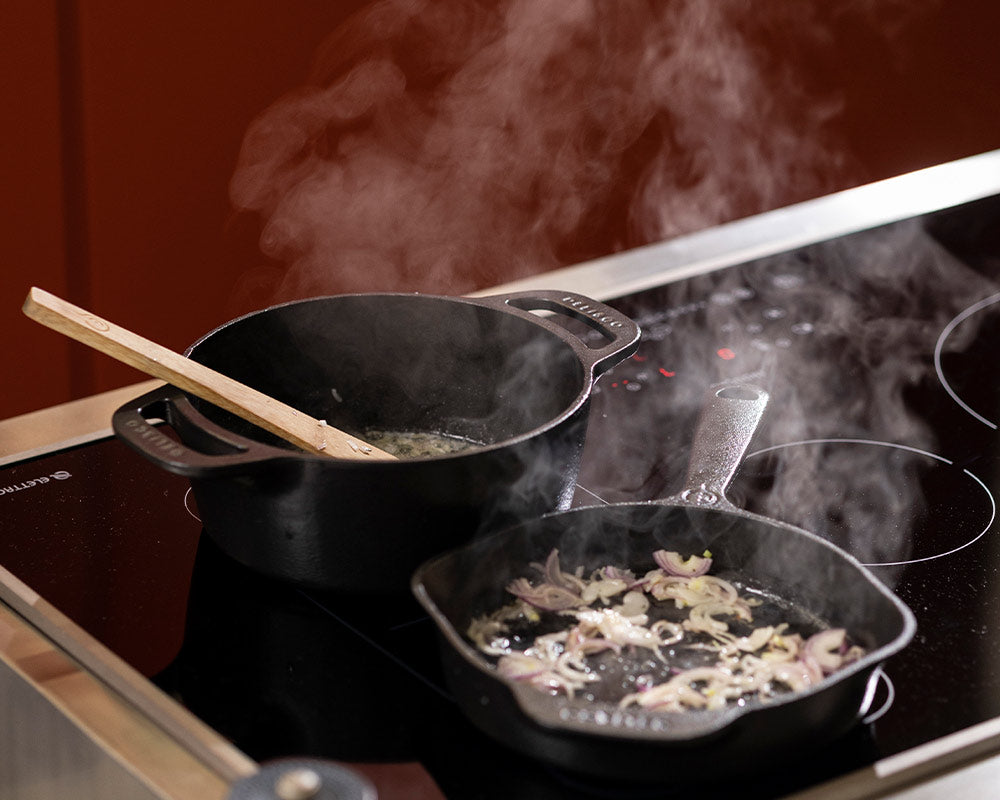Cozinhar em uma panela de ferro fundido em um fogão de indução é praticamente igual a usar qualquer outra superfície de cozimento. No entanto, há duas dicas importantes que valem a pena destacar: