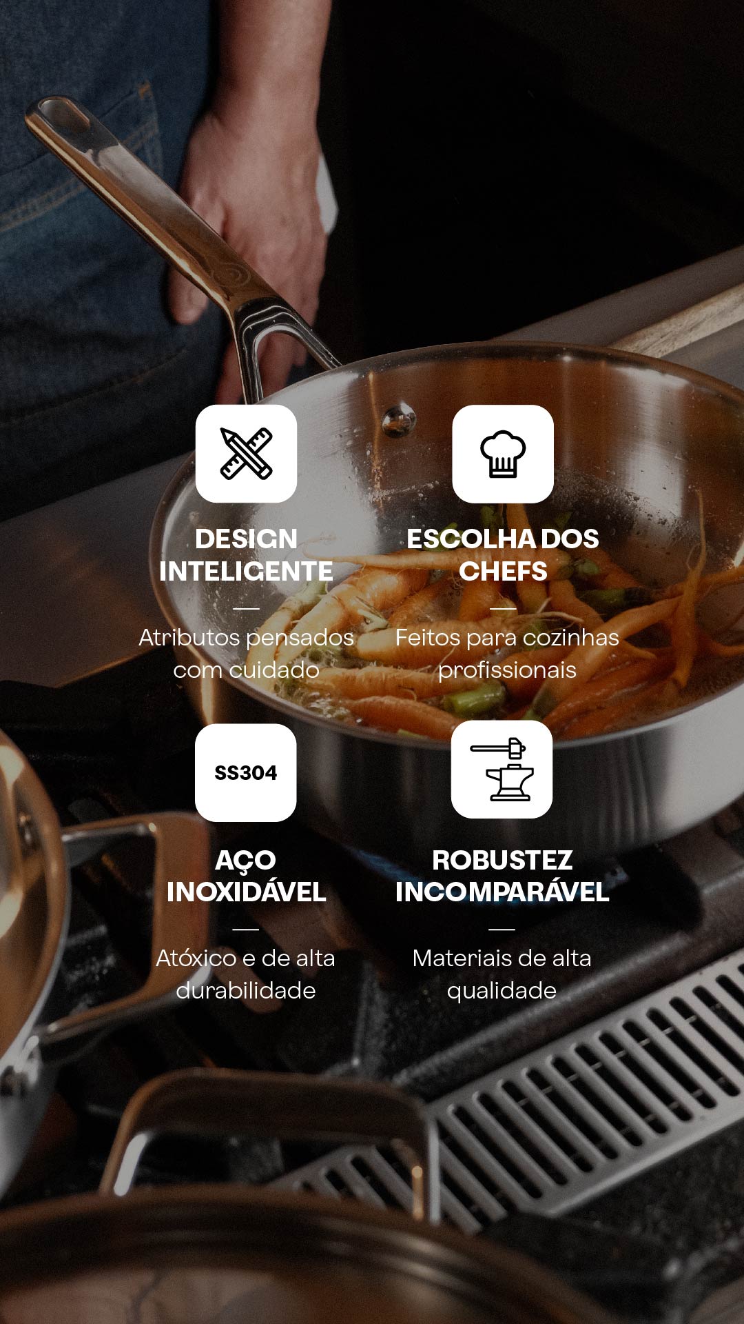 A construção em tripla camada incorpora um núcleo de alumínio que se estende da base até a borda, garantindo uma distribuição superior de calor por toda a superfície interna e assegurando um cozimento uniforme e mais rápido dos alimentos.