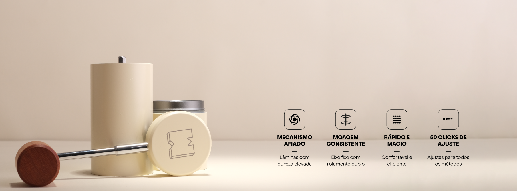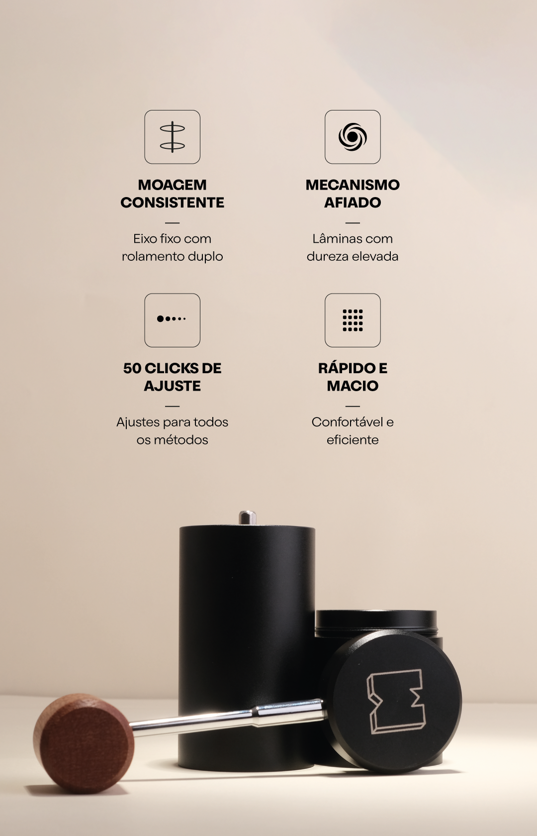 O coração de um bom moedor são as suas lâminas. Perfeitamente afiadas e produzidas em aço inox, nosso mecanismo tem 50 cliques de ajuste, podendo moer de espresso a prensa francesa