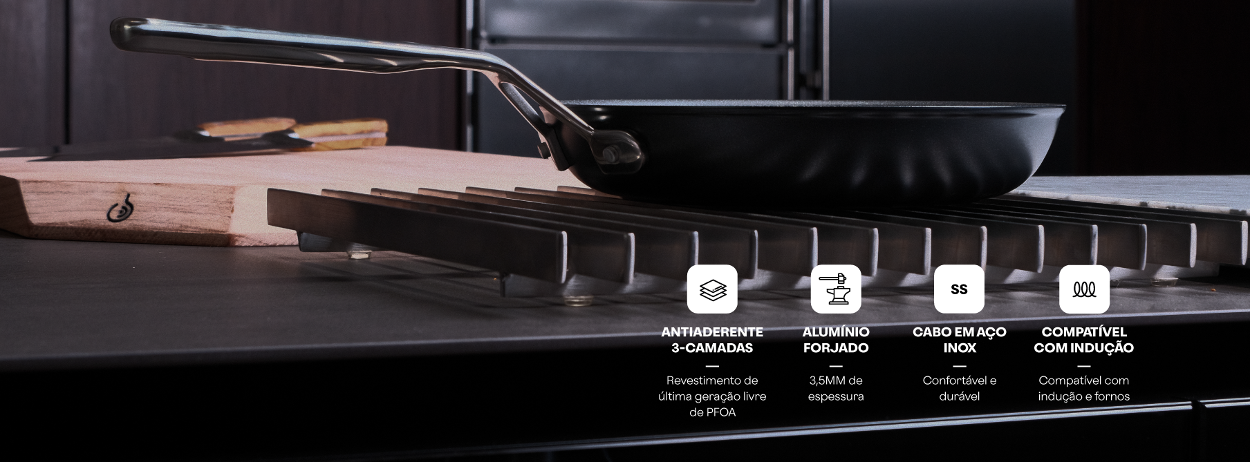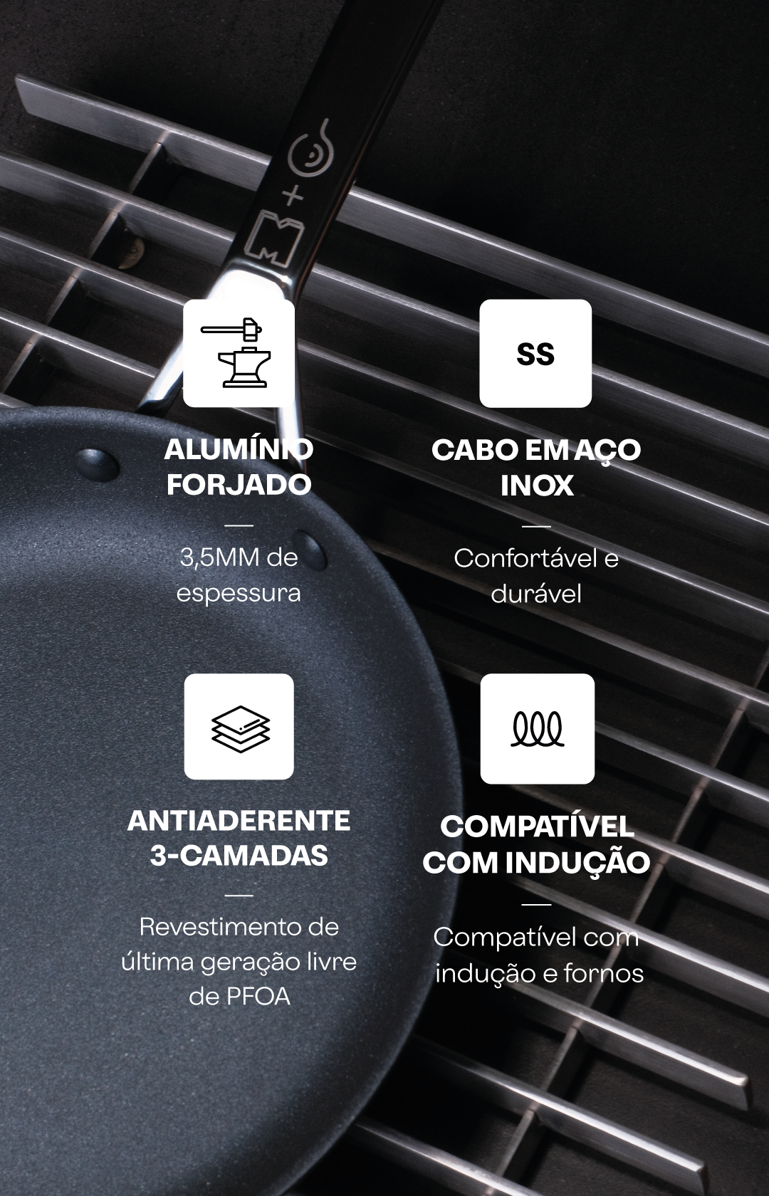 Com corpo forjado em alumínio de 3,5 mm de espessura, ela resiste à deformação mesmo com o uso intenso. Seu revestimento antiaderente de última geração, livre de PFOA, é aplicado com tecnologia de plasma para garantir uma performance impecável por mais tempo. O cabo ergonômico em aço inox rebitado, no formato "Y", permanece fresco ao toque, proporcionando segurança e conforto no manuseio.