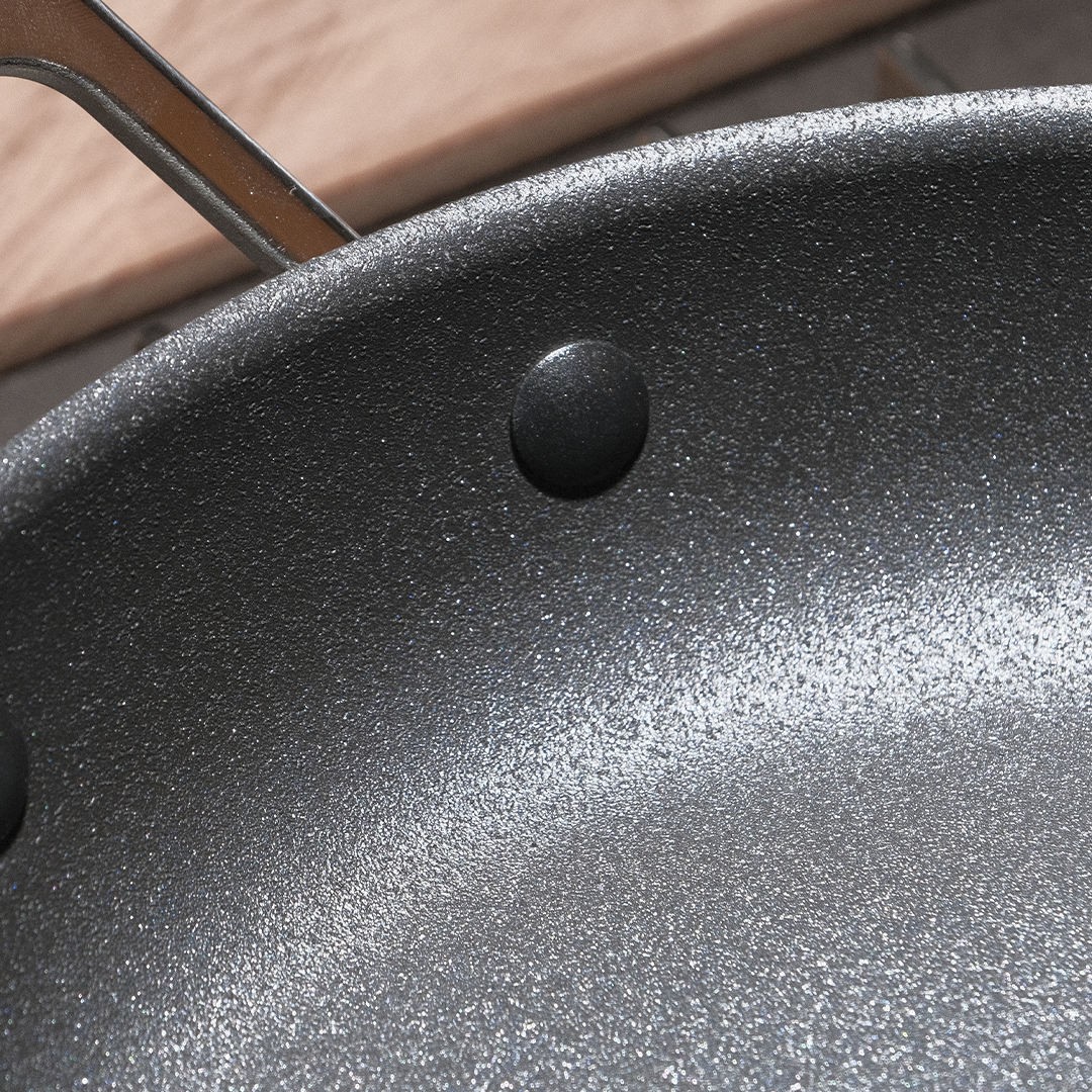 Frigideira em alumínio forjado com 3,5mm de espessura. Revestimento antiaderente de 3 camadas livre de PFOA. Cabo rebitado em aço inox.