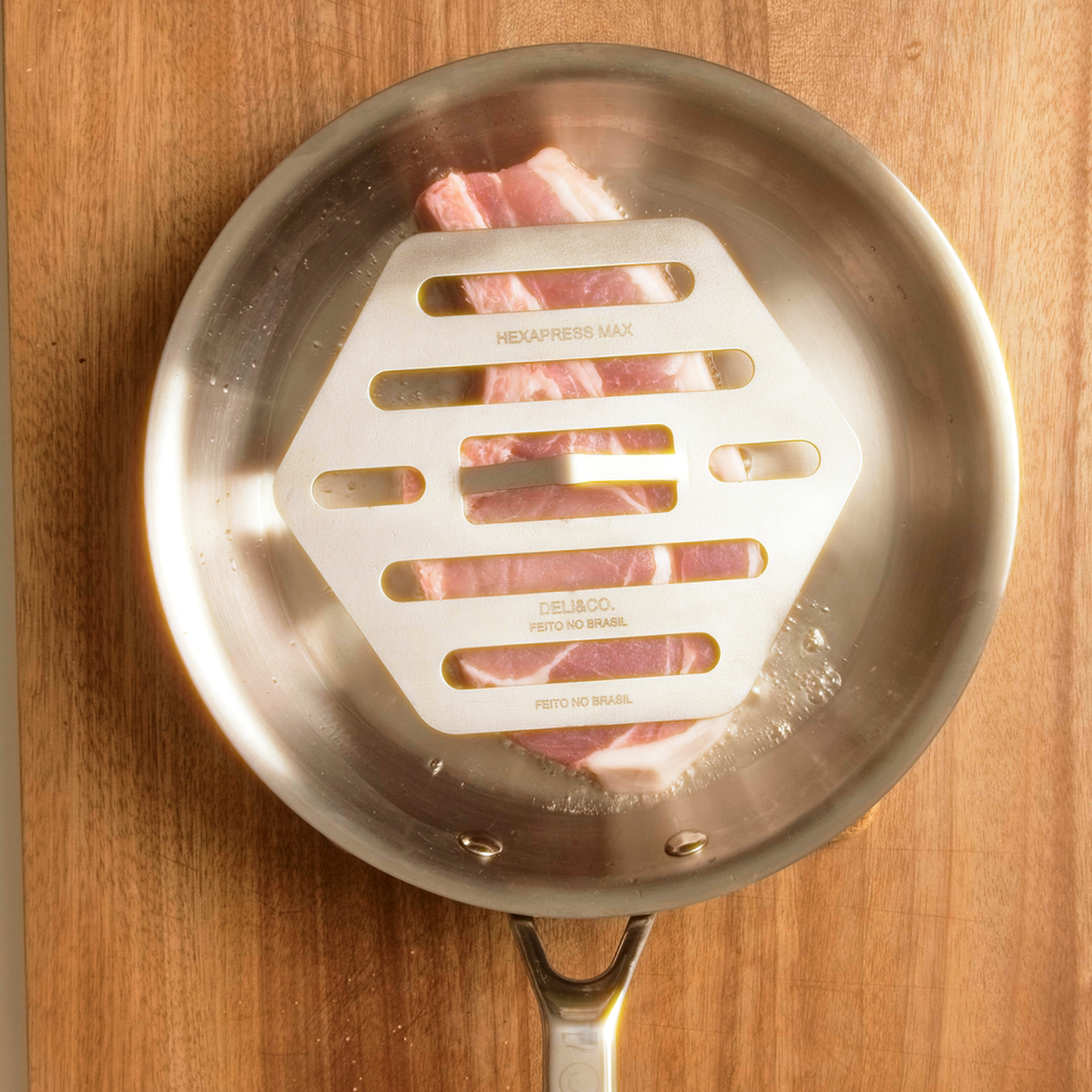 Ao aplicar peso uniforme e manter o alimento pressionado contra a superfície quente, o Hexapress: